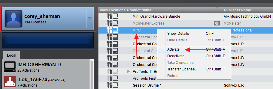 - Find your software license in the list, right-click and select Activate.