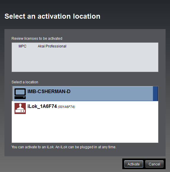 4. You will be prompted to choose a location to store the license. Use this opportunity to choose your host computer or a connected iLok dongle. Choose one and select Activate.