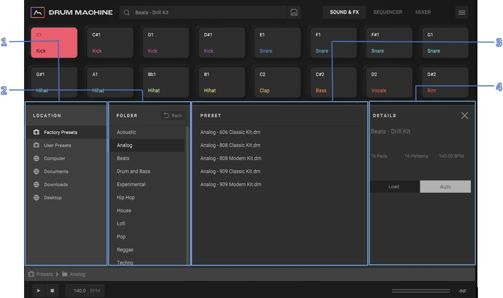 - Location - Contains menu items to navigate kit presets, sample packs, and your local sample collections.