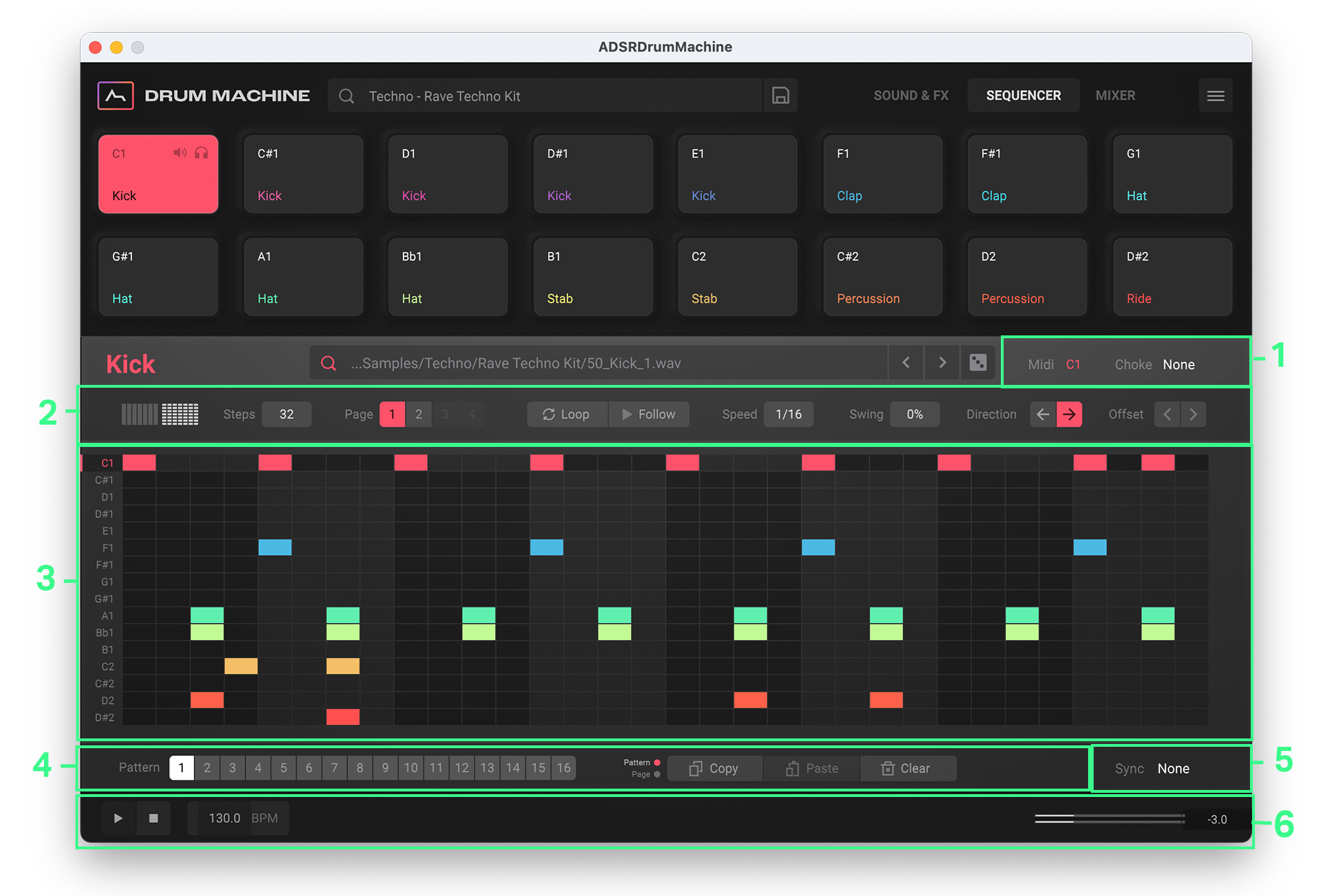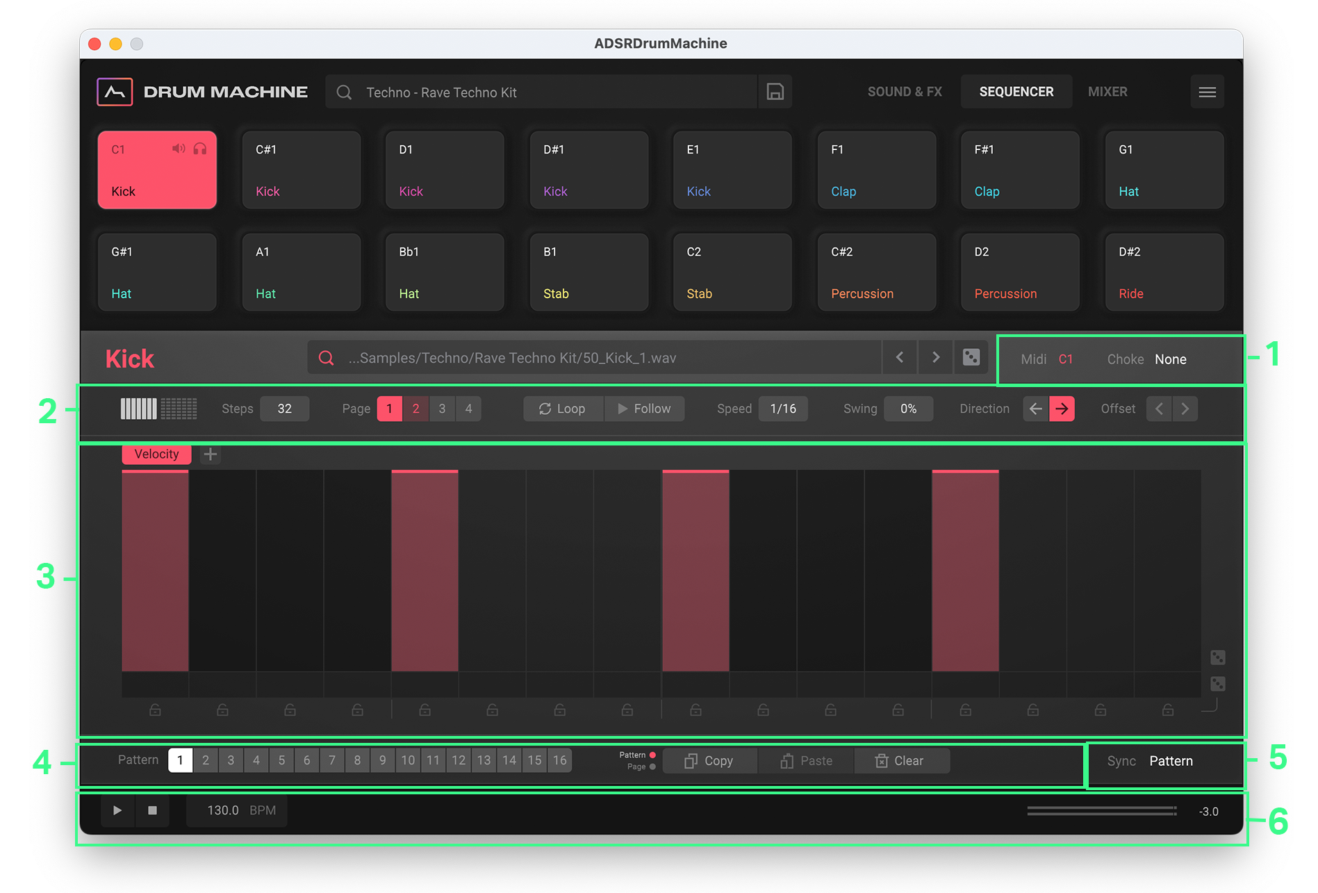 The Drum Machine has 5 main views, where you have access to all the parameters needed to use the software :