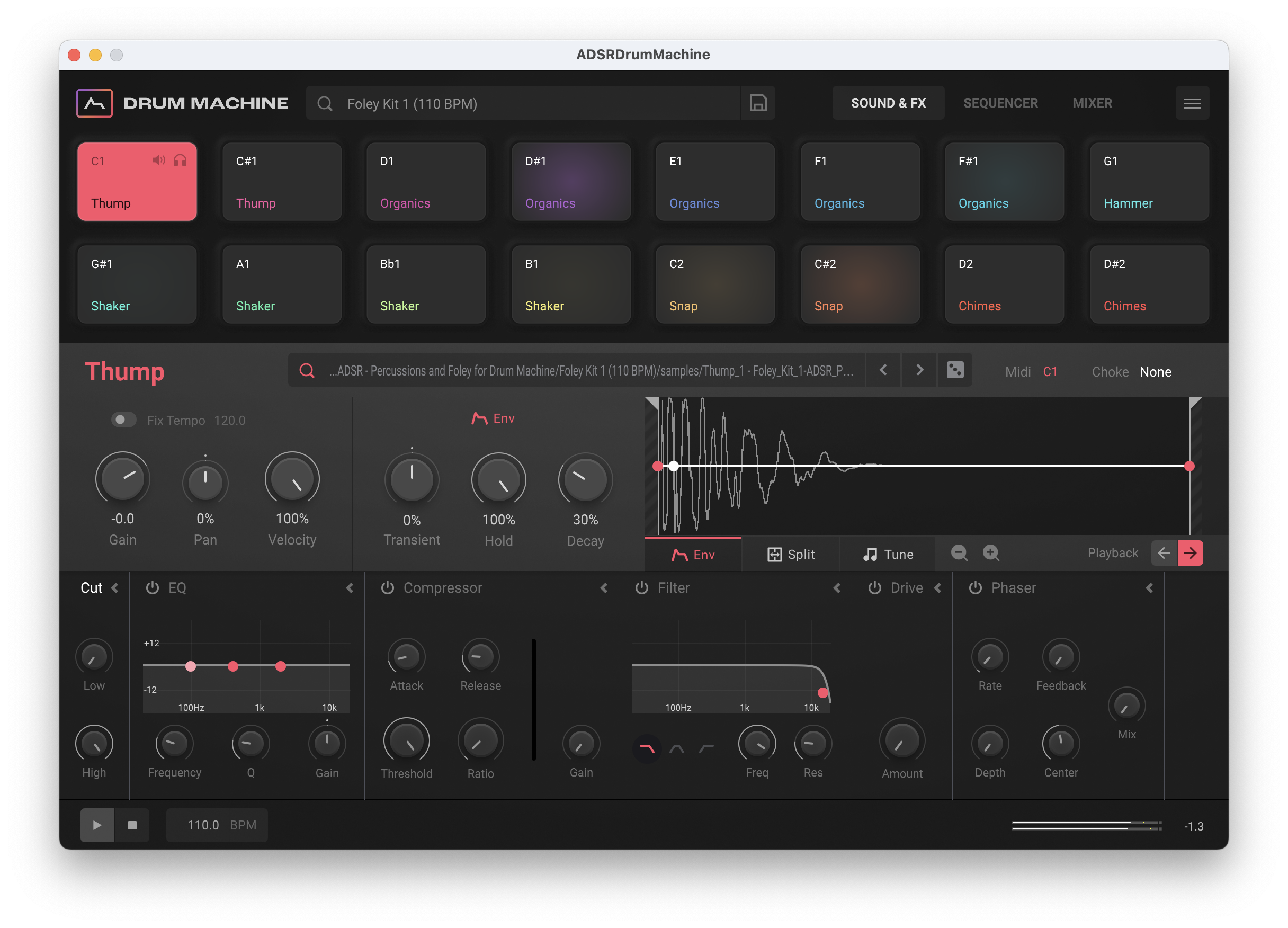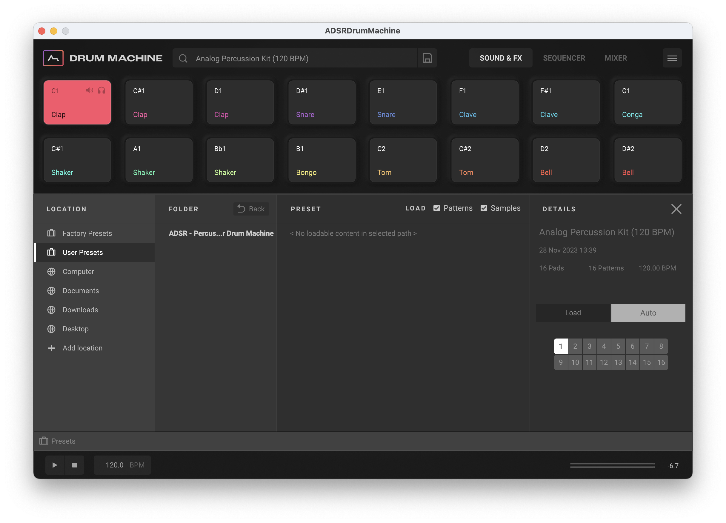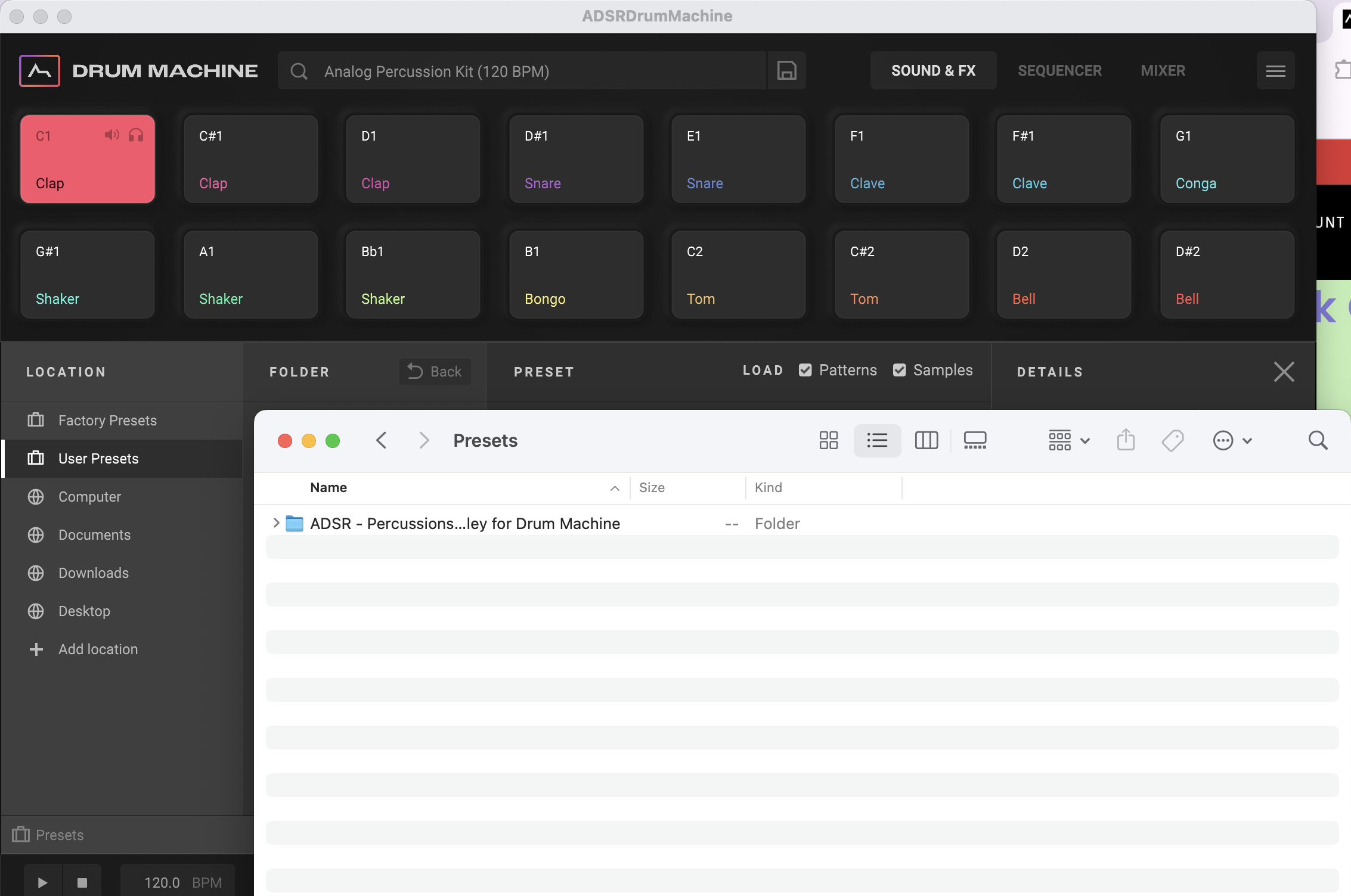 Launch ADSR Drum Machine. Your custom kits will now appear under the User Presets tab in the Kit Browser and can be loaded instantly.