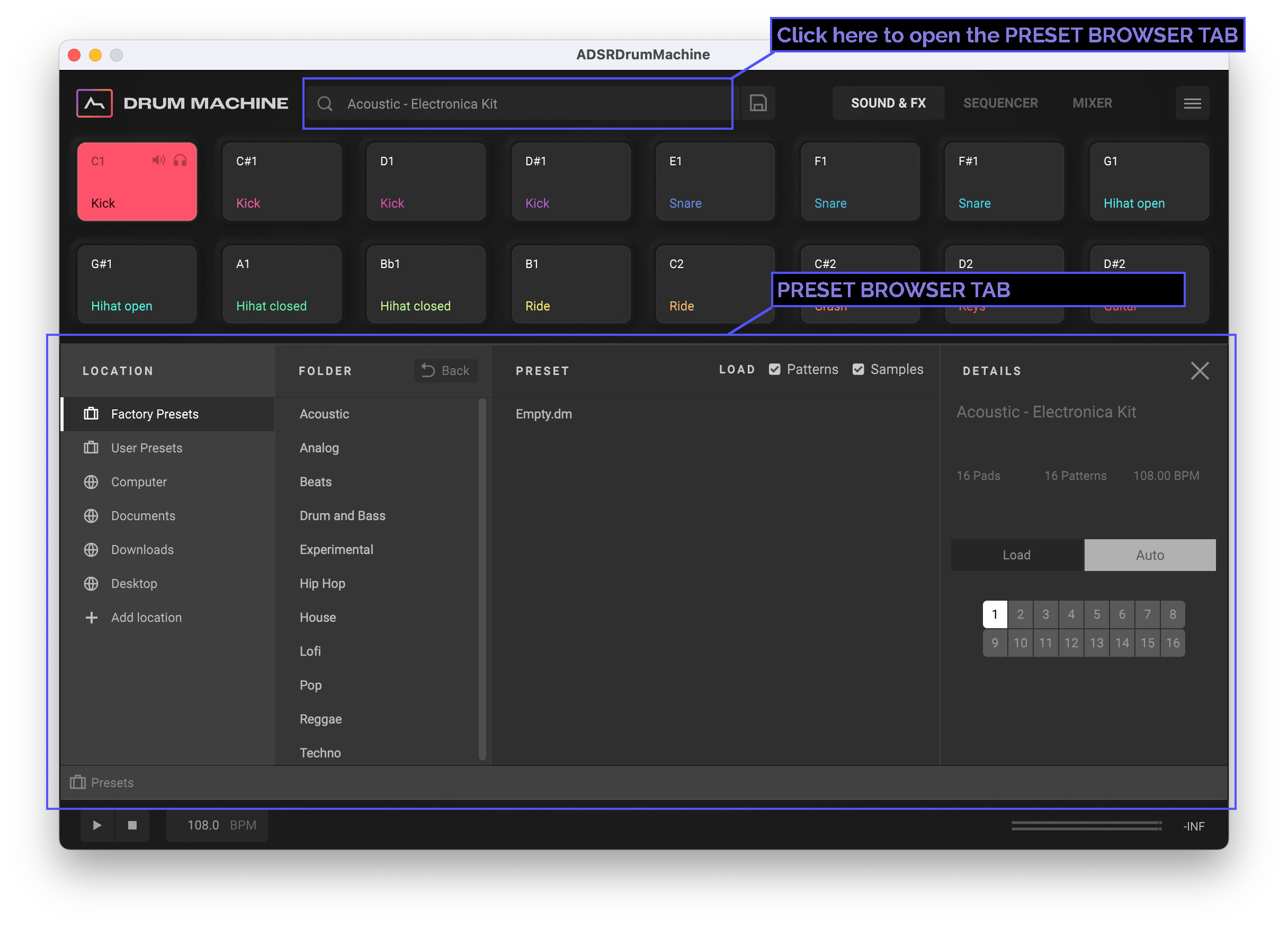 - Open the ADSR Drum Machine directory, then the Presets folder